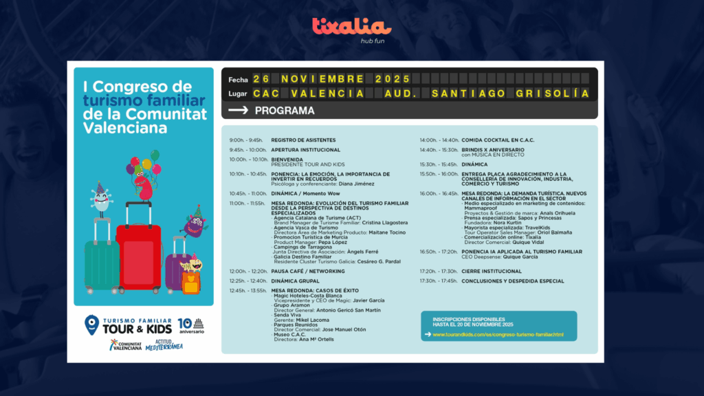 El próximo miércoles 26 de noviembre de 2025, Tixalia participará en el I Congreso de Turismo Familiar de la Comunitat Valenciana, organizado por Tour & Kids con motivo de su 10º aniversario, en el Auditorio Santiago Grisolía de la Ciudad de las Artes y las Ciencias (Valencia).
