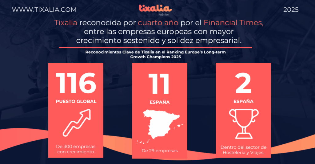 Tras haber formado parte del ranking FT 1000 Europe’s Fastest Growing Companies en 2018 y 2019, y Europe´s Long-term Growth Champions 2024, Tixalia vuelve a ser reconocida en 2025 como una de las Europe’s Long-Term Growth Champions. Un distintivo reservado a las empresas que han mantenido un crecimiento orgánico, innovador y sostenible durante los últimos diez años, demostrando una notable capacidad de adaptación, resiliencia e innovación. Este reconocimiento sitúa a Tixalia entre las empresas europeas más sólidas, reflejando una trayectoria basada en la innovación tecnológica, la diversificación de producto y la colaboración con los principales operadores del sector del ocio y el turismo.