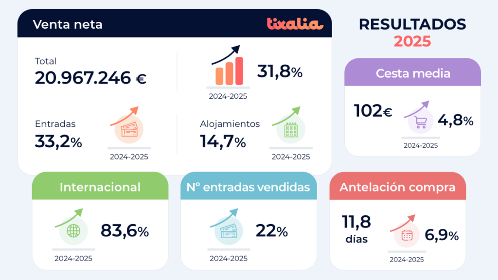 Tixalia ha cerrado el ejercicio 2025 con 20.967.246 € en ventas netas, lo que representa un crecimiento del 31,8 % respecto a 2024. Estos resultados consolidan el posicionamiento de la compañía como operador referente en la comercialización de entradas de espectáculos y experiencias en España.